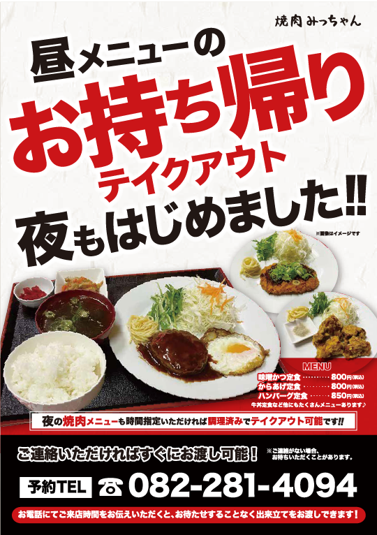 安芸郡府中町・向洋駅近くの焼肉 みっちゃんのテイクアウトを告知するためのポスターを作成。
